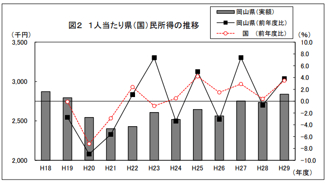 岡山県の県民所得も、県内総生産と同様2年ぶりに増加しました。 岡山県民の1人あたりの所得は283万9,000円 で、前年度比で3.8%の上昇となっています。