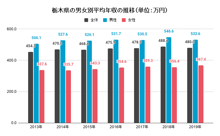 2019年の栃木県の平均年収は480.0万円ですが、これを男女別に見ると、男性のほうが165万円ほど高い水準にあります。