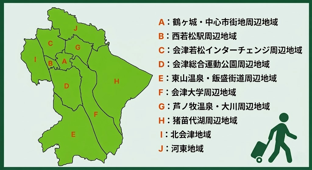 一方、家族世帯に目を向けると、5人以上の世帯割合が高いのは猪苗代湖周辺地域の20.0%、北会津周辺地域の17.5%、河東地域の17.6%です。西若松駅周辺地域は人口19,308人・世帯数7,914、東山温泉・飯盛街道周辺地域は人口10,827人・世帯数4,911、会津若松インターチェンジ周辺地域は人口6,649人・世帯数2,461と、それぞれ規模感が異なります(参照*2)。通勤経路、子どもの通学距離、日常の買い物環境を照らし合わせながら候補を絞り込んでいくとよいでしょう。
