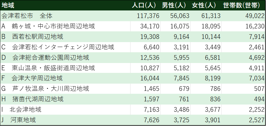 会津若松市は地域ごとに世帯構成や人口密度が異なるため、自分の生活スタイルに合ったエリアを選ぶことが大切です。会津若松市の令和2年国勢調査の資料によると、鶴ヶ城・中心市街地周辺地域は人口34,170人・世帯数16,230で、1人世帯の割合が43.3%と市内で最も高い数値を示しています。会津大学周辺地域も1人世帯が42.3%で、単身での移住に向いた環境といえます(参照*2)。