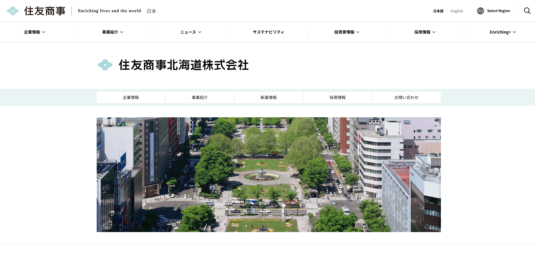 住友商事北海道株式会社は、住友商事グループの地域事業会社に位置づけられる総合商社です。 扱う品目は、金属・建設・資材・情報・電気・機械・施設・通信・エネルギー・農水産・化学品と多岐にわたります。トレーディングを通して、北海道に優位性がある食品や農業がより競争力を高められること、そして人々の豊かな生活を実現できることを目指しています。また、ソーラーパワー苫小牧株式会社や北海道シャーリング株式会社など、地元企業への事業投資にも注力しています。