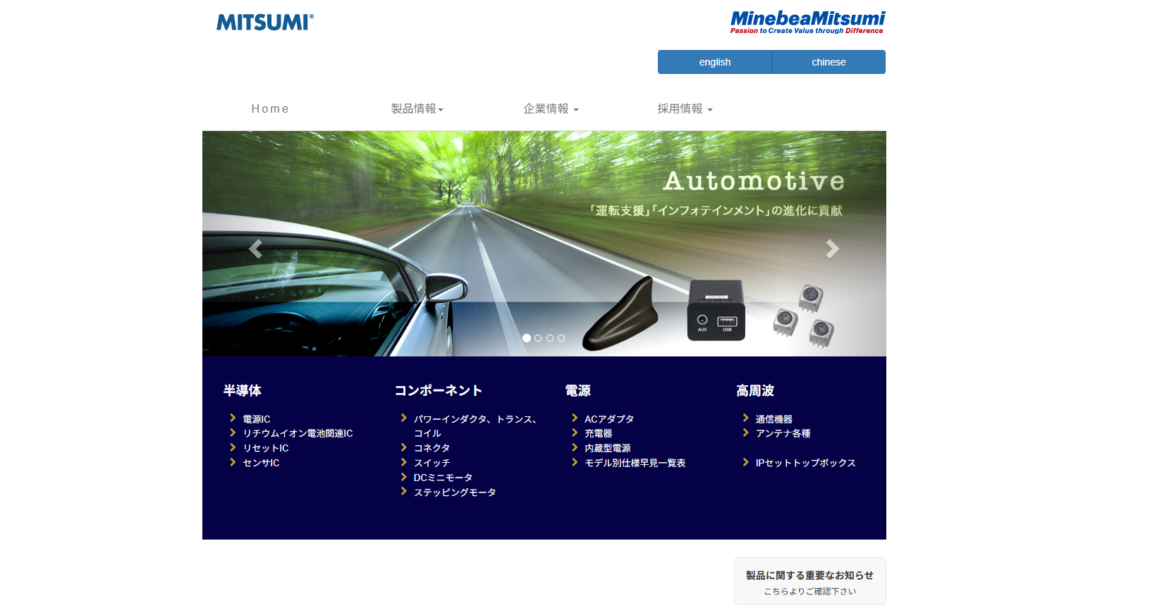 ミツミ電機株式会社は、電気機械器具や計測機械器具を製造する半導体メーカーです。2024年5月にミネベアパワーデバイス株式会社の事業が加わり、アナログ半導体やセンサー、パワー半導体といった各種半導体分野でシナジーを生み出しています。当社が製造する半導体は、車載・EV・医療装置・空調機器・家電製品・アダプタ・産業機器まで幅広い分野で活用されています。
