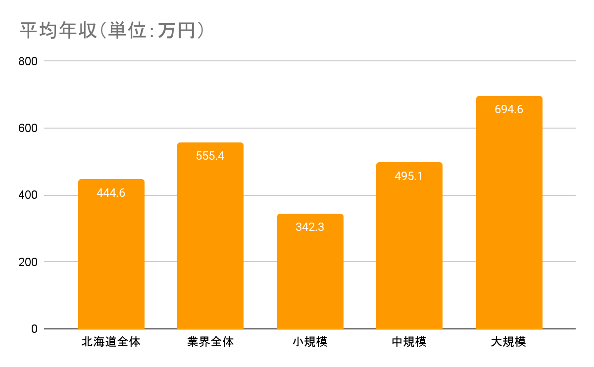 中規模・大規模であれば北海道全体の平均年収を上回っているため、高年収を目指す方は従業員数にも注目して企業を探してみてください。