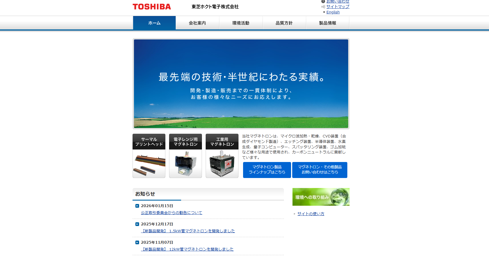 東芝ホクト電子株式会社は、東芝グループの電子デバイス製造・販売会社です。当社が製造するマグネトロンは、半導体製造装置において活躍しています。開発・製造・品質の一貫体制、東芝ブランドの幅広いネットワークが強みです。