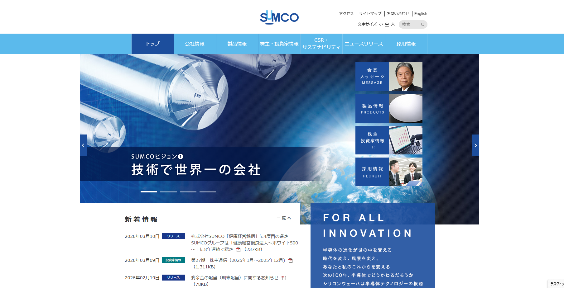 株式会社SUMCOは、半導体デバイスの基板材料となるシリコンウェーハの製造を行う半導体メーカーです。厳密な品質管理のもとで、超高純度・超高品質なシリコンウェーハの製造を実現しています。
