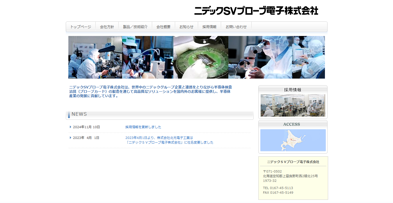ニデックSVプローブ電子株式会社は、各種プローブカードを製造するメーカーです。プローブカードとは、半導体の製造工程において、シリコンウェーハの状態で回路が正しく動作するかをチェックするための検査用治具です。2023年4月1日に、株式会社北光電子工業から社名変更しています。