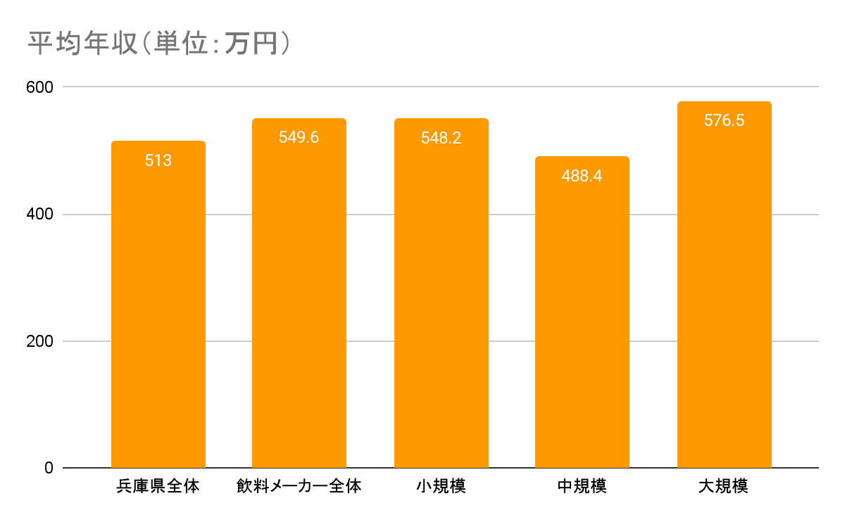 兵庫県内における飲料メーカー全体の平均年収は約549.6万円で、兵庫県全体の平均年収である約513万円よりも高年収となっています。