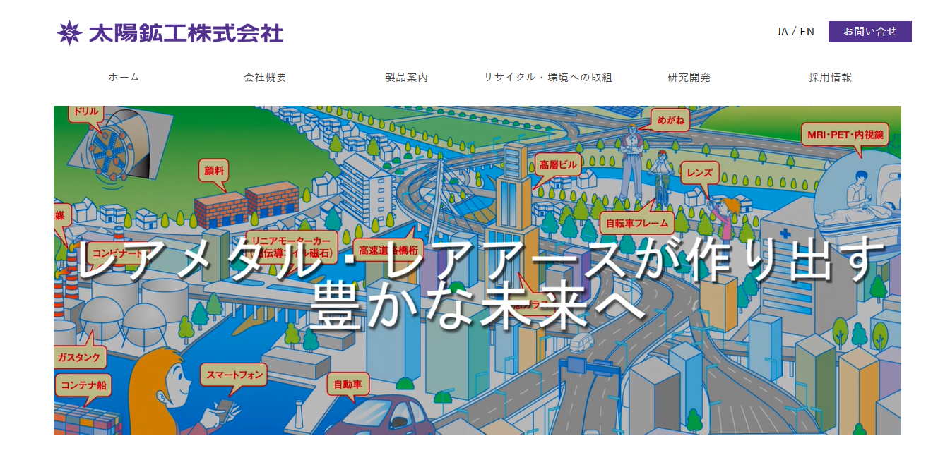太陽鉱工株式会社は、伝統と最先端技術を融合させ、モリブデンやバナジウムなど素材の開発・製造を手がけている鉄鋼メーカーです。人と地球に優しい資源リサイクルにも力を入れ、品質の安定と地球環境の保護に役立てています。