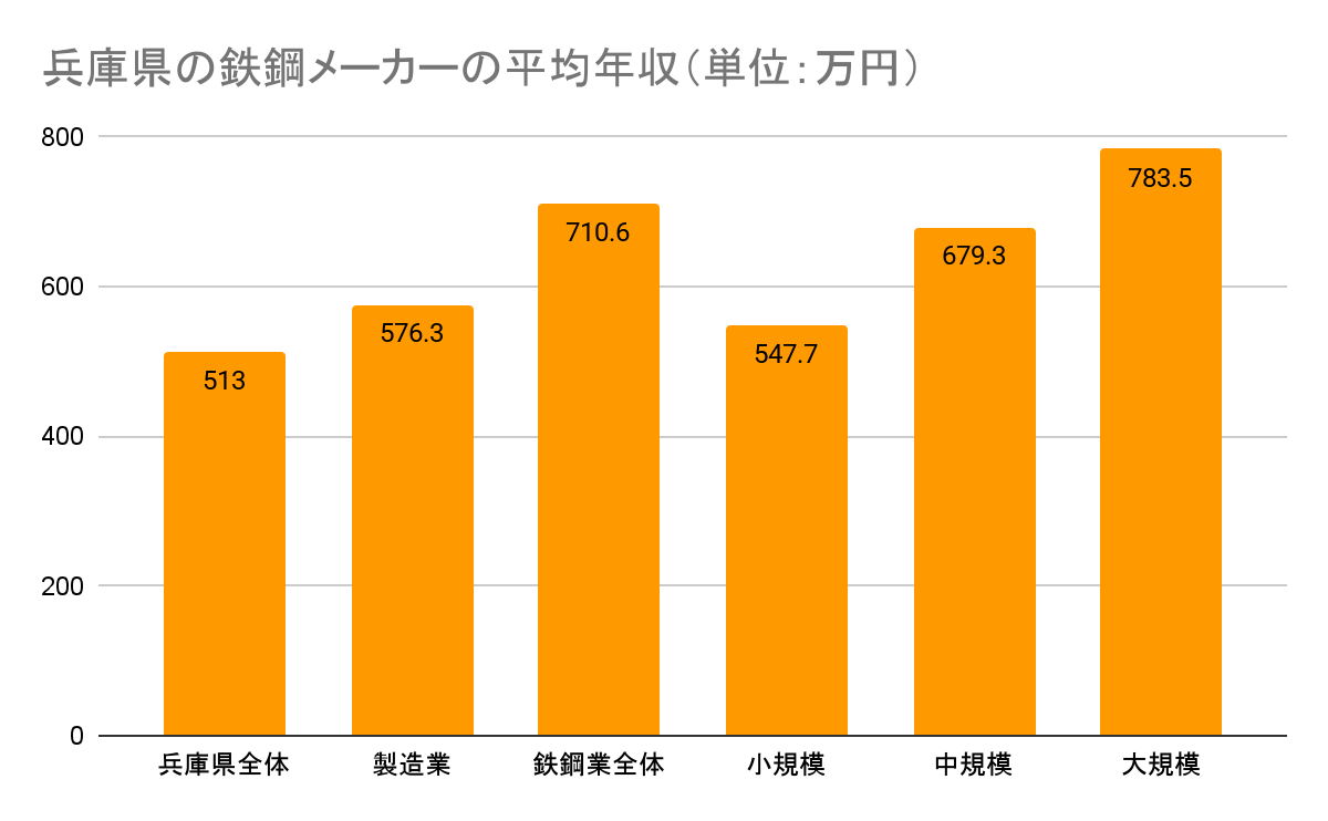 兵庫県の鉄鋼メーカーは軒並み年収水準が高く、小規模でも県全体の平均年収を上回っています。特に大手鉄鋼メーカーの平均年収は800万円に迫り、製造業のなかでもトップクラスの年収水準です。