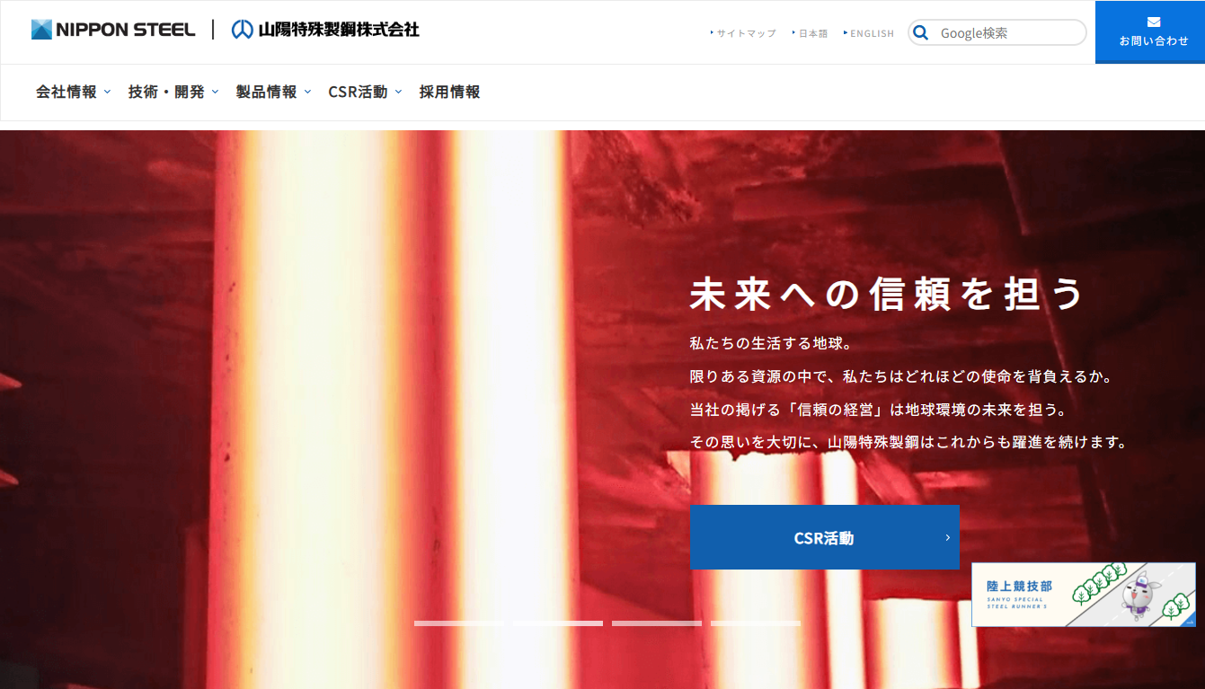 山陽特殊製鋼株式会社は、鋼の清浄度を極限まで高める技術を用い、主力商品である軸受鋼をはじめとする鋼鋼材や策形材などを製造する鉄鋼メーカーです。ここで製造した鋼は、「高信頼性鋼」として、自動車・鉄道・建設機械など、さまざまな産業分野で幅広く活用されています。
