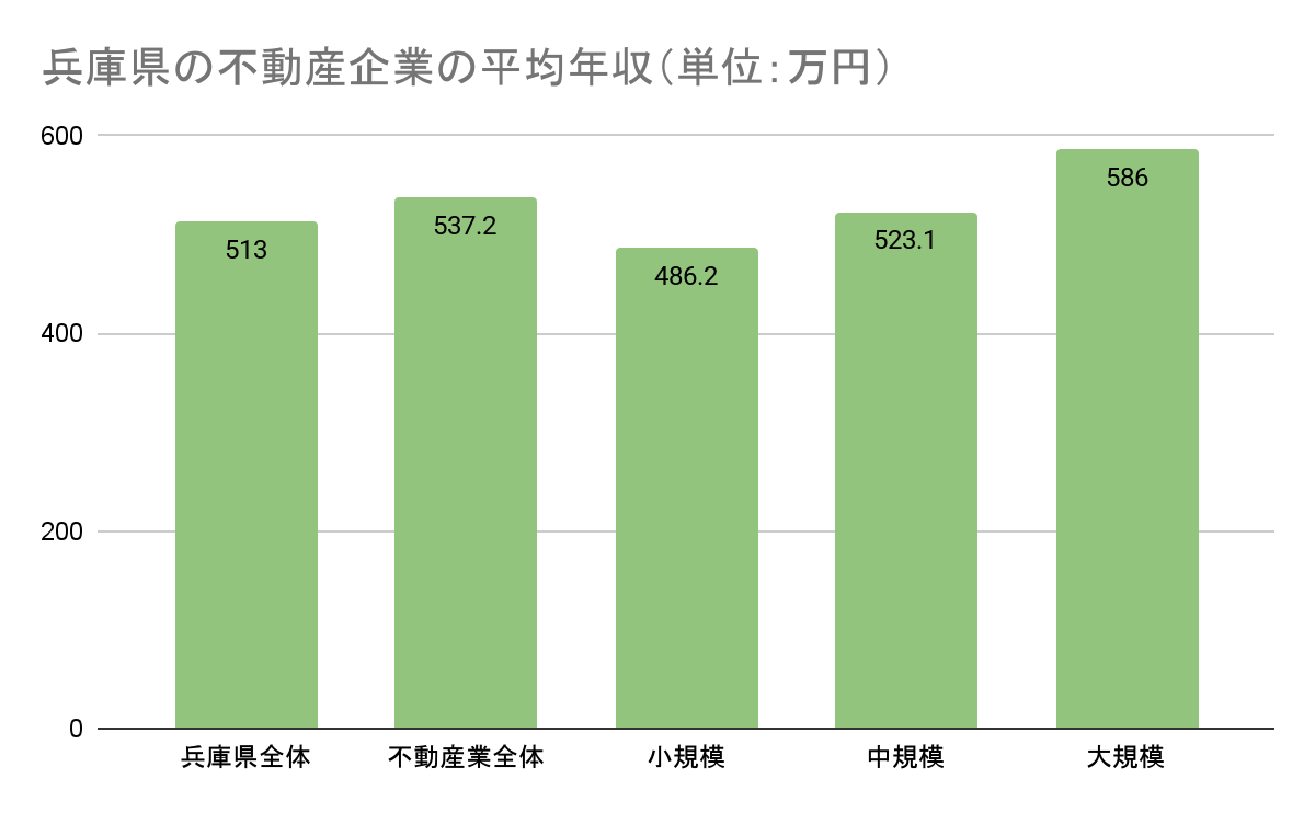 厚生労働省が公表している「令和6年賃金構造基本統計調査」によると、兵庫県全体(産業計)と不動産業界全体、そのうち企業規模別の平均年収は上記グラフの通りです。
