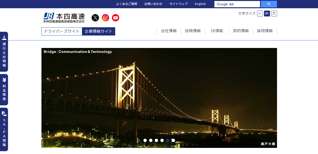 本州四国連絡高速道路株式会社は、本州と四国を結ぶ瀬戸大橋・明石海峡大橋など、自動車専用道路等の建設および維持管理、休憩施設の運営などを行っている企業です。地域のインフラを維持することで、経済の発展と生活の質の向上に努めています。