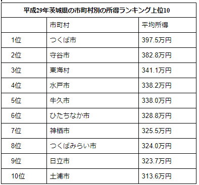 平成29年度の総務省の資料によると、茨城県で最も平均所得が高い市町村はつくば市で397.5万円