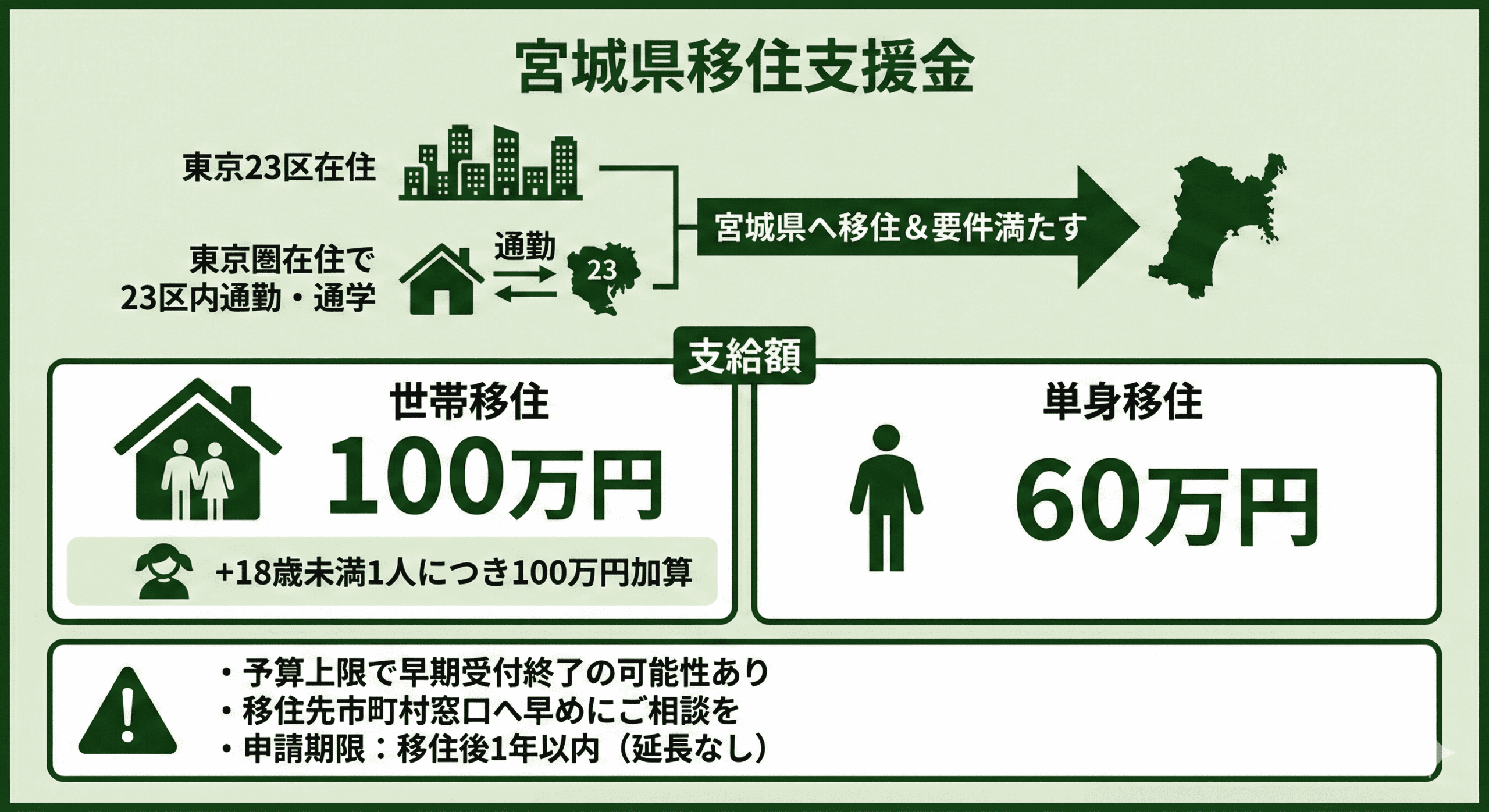 東京圏からの移住者を対象とした支援金制度があります。宮城県は、東京23区に在住または東京圏在住で23区内に通勤する方が宮城県に移住し、対象求人へ就業する等の要件を満たす場合に、世帯移住で100万円、単身移住で60万円を支給する制度を実施しています。世帯移住で18歳未満の世帯員が一緒に移住する場合は、1人につき100万円が加算されます(参照*21)。