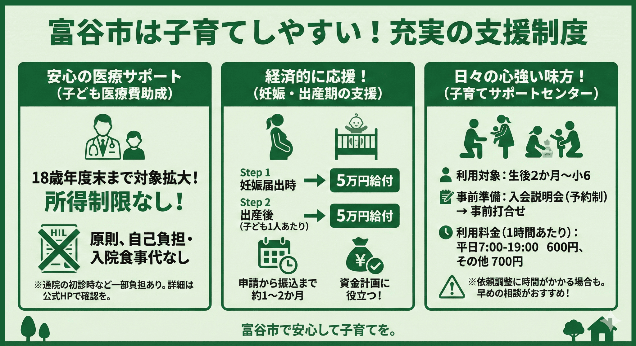 これらの支援制度は年度ごとに内容や予算が変更される可能性があるため、最新情報は必ず富谷市公式サイトで確認してください。