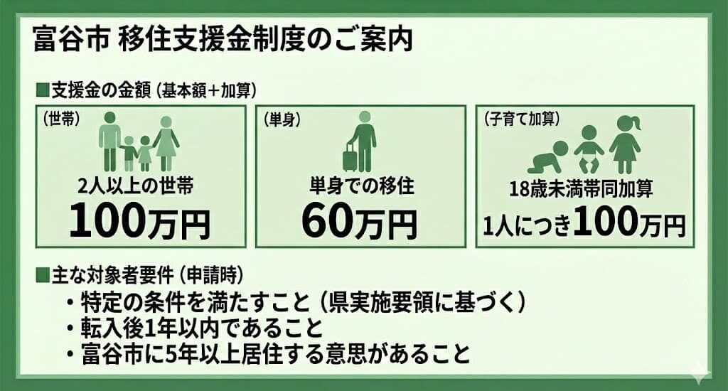 富谷市移住支援金は、東京23区に在住または東京圏在住で23区内に通勤していた方が富谷市に移住し、対象求人への就業等の要件を満たした場合に支給されます。金額は世帯移住で100万円、単身移住で60万円です。18歳未満の世帯員を帯同する場合は1人につき100万円が加算されます(例:夫婦+子ども2人の場合、最大300万円)(参照*16)。